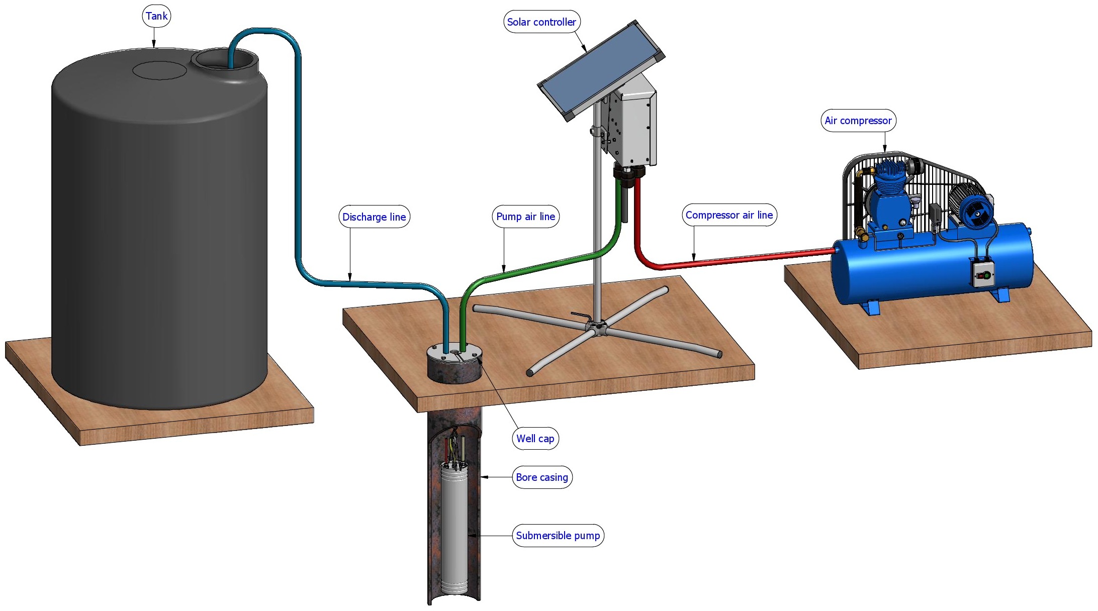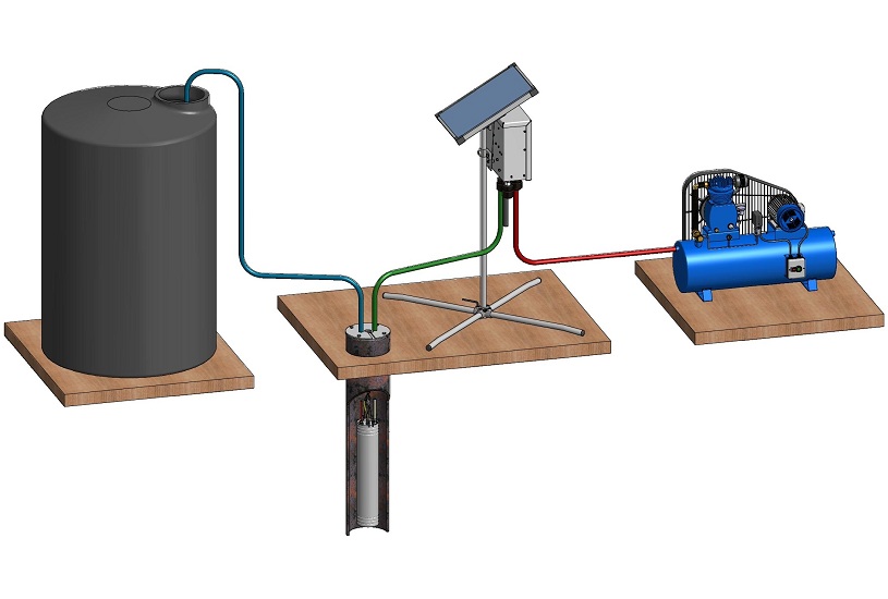 - An air compressor located close to an outlet, is providing the energy required to pump the water from inside the bore on to the surface.